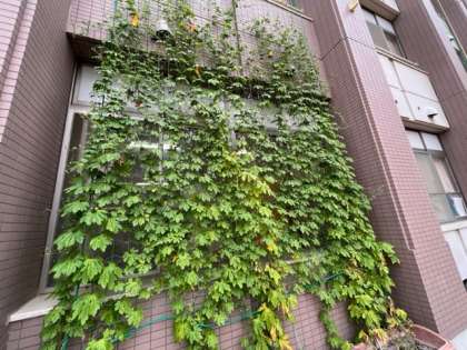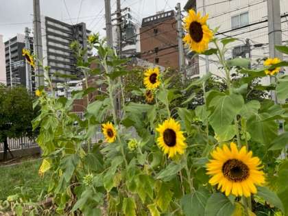 運動場側の職員室前のゴーヤ、学習園のひまわりがすくすく育っています。