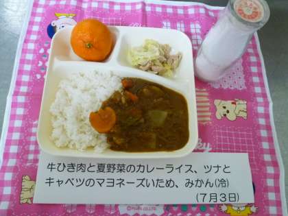 なすやピーマン、セロリの入ったカレーは、少し野菜の苦みがありましたが、チューリップの形のラッキーにんじんが入っていて、みんながんばって食べていました。冷凍みかんは、ひんやりしておいしかったです。
