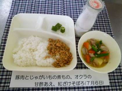 豚肉とじゃがいもの煮物に、三度豆(さやいんげん)が入っていました。旬のオクラは色よく仕上がり、甘酢の味がよく合っていました。手作りの紅鮭そぼろは、青のりが入って色よく、米飯がすすみました。