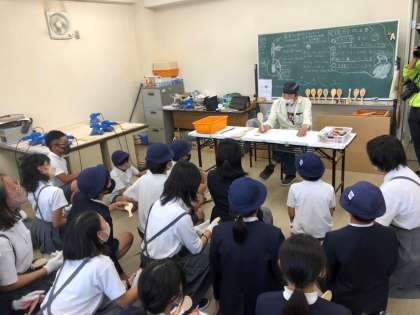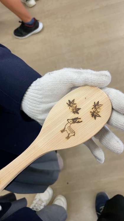 宮島の名産品、しゃもじの絵付け体験の様子です。