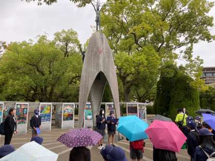 平和記念公園に到着しました。小雨の中、平和集会を行い、平和への祈りを捧げました。