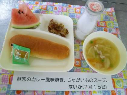 メインの豚肉は、カレーの香りがスパイシーで、暑い時に食べやすかったです。野菜たっぷりのスープとふわふわのコッペパンもおいしかったです。すいかは、鳥取産でした。扇町小学校の給食室には、大型の冷蔵庫があるので、よく冷えたすいかを出していただきました。