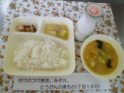 1学期最後の給食は、夏が旬の冬瓜(とうがん)が出ました。しょうがのきいただしで煮て、とろみをつけています。夏が旬ですが、保存がよく、冬まで日持ちすることから、冬の瓜と書いてとうがんと読みます。旬の味わいを楽しみました。