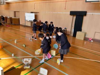 今日は一年生を招待して、生活科で作った動くおもちゃで遊んでもらいました。