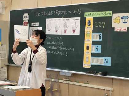 12日木曜日3年生では、栄養教諭の岡田先生に栄養指導をしてもらい「ほねをじょうぶにする食べ物」について学習しました。