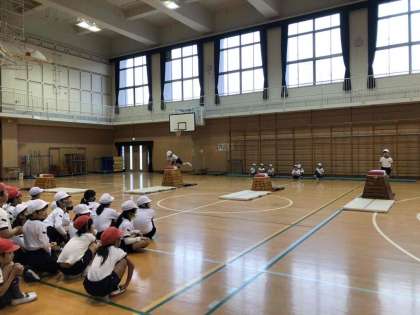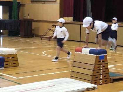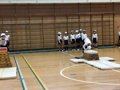 友だちとコツを教え合いながら、全員が開脚跳びを練習し、チャレンジタイムではかかえ込み跳びや台上前転にも挑戦しています。写真は発表会の様子です。