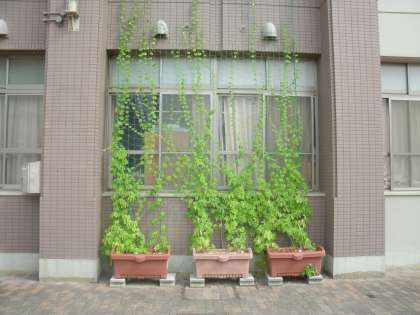 エアコンの設置で快適になった扇町小学校ですが、壁面緑化の取り組みも引き続き行っています。緑のカーテンで、見た目にも実感としても涼しくさわやかな環境づくりを目指します。