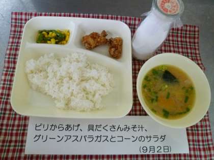 今日は十三小学校の児童が考えた「献立コンクール」入賞献立でした。コチジャンをきかせた「ピリからあげ」は、さくさくしておいしかったです。みそ汁には、かぼちゃ、とうふ、豚肉、ねぎなどいろんな具が入ってヘルシーでした。アスパラとコーンは彩りよく、りんご酢の酸味が効いてさっぱりと食べられました。