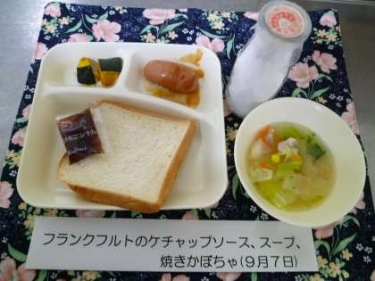 食パンにはいちごジャムがついていました。フランクフルトに具だくさんのスープ、焼きかぼちゃもついてボリュームがありました。教育実習・栄養教諭実習が始まり、実習生も子どもたちと一緒に楽しく食事をしました。