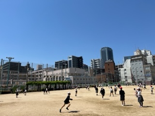 少しずつ気温も暑くなってきましたが、暑さに負けず元気に運動場で遊ぶみなさん。