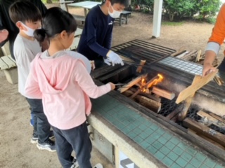 初めて火をおこす子がほとんどが、おいしい晩御飯のため、協力して頑張っています!!