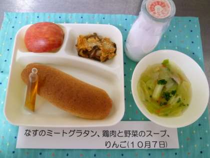 ライ麦パンは焼き立てでふわふわでした。アルゼンチン産のはちみつがつきました。(本来は5日に出る分ですが、代休のため)。旬の名残のなすをミートグラタンにしました。スープはじゃがいもも入ってボリュームがありました。りんごは長野県産、フレッシュでおいしかったです。