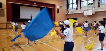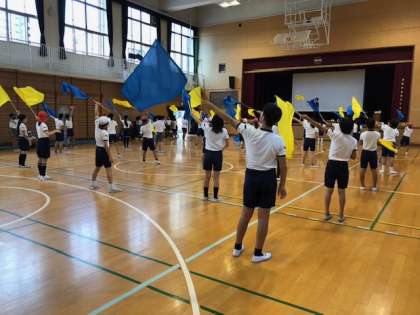 団体演技では、フラッグ運動に取り組みます。どのようなテーマなのか、どんな思いを持って練習してほしいのかを伝えました。