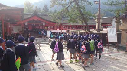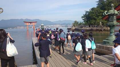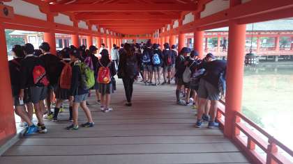 宮島に到着しました。まずは世界文化遺産、嚴島神社を訪れました。平安時代の寝殿造りを取り入れた建物が、美しい景色と合わさってすばらしいです!