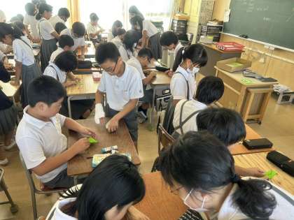 その後、折り鶴をいっしょに折りました。慣れない手つきの人もいれば、中には6年生より上手に折る人も!?