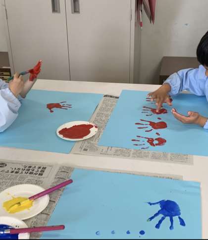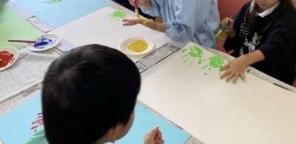 図画工作の学習で手に絵の具を塗って、手形でいろいろなものに見立てて絵を描きました。やってみると魚に見える!花に見える!ちょうに見える!などいろいろなものが見えてきました。教室や階段に掲示しています。参観のときにはぜひ見てください。