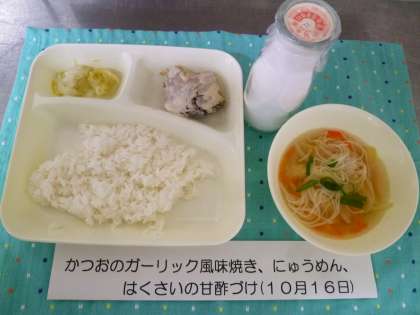 かつおのガーリック風味焼きは、ノンエッグタイプのマヨネーズを使い、卵アレルギーの児童も食べられるようになっていました。手間をかけてとっただしの香りがよいにゅうめんは、あげや野菜がいろいろ入っておいしかったです。
