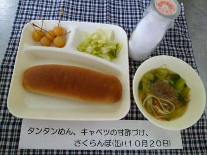 低学年が遠足に出かけているので、少し寂しい給食時間でした。メニューはピリ辛の肉みそがのったタンタンメンでした。さくらんぼは、缶詰にすると赤い色が退色します。給食では着色料を使用していないので、黄色いさくらんぼでした。