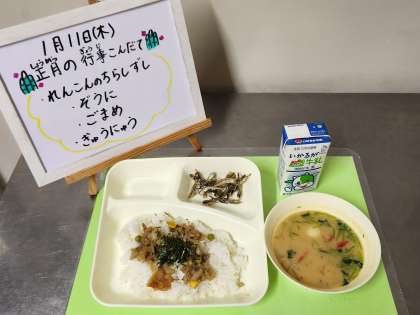 献立は、れんこんのちらしずし、ぞう煮、ごまめ、牛乳です。