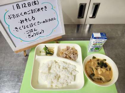 今日の献立は、豚肉のごまだれ焼き、みそ汁、きくなとはくさいのおひたし、ごはん、牛乳です。
