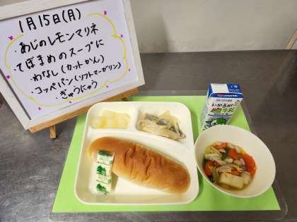 今日の献立は、あじのレモンマリネ、てぼ豆のスープ煮、和なし(カット缶)、コッペパン、ソフトマーガリン、牛乳です。
