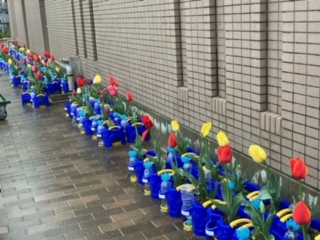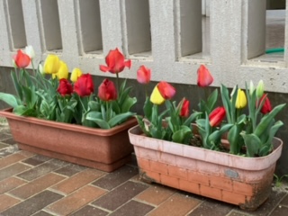 新2年生が冬に球根を植えたチューリップが綺麗に咲き始めています。
