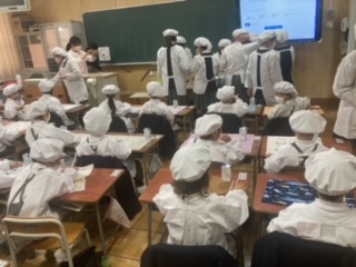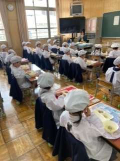 6年生に準備のお手伝いをしてもらいながら、小学校での初めての給食を、楽しく美味しそうに食べています。