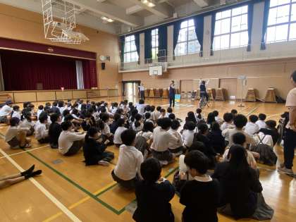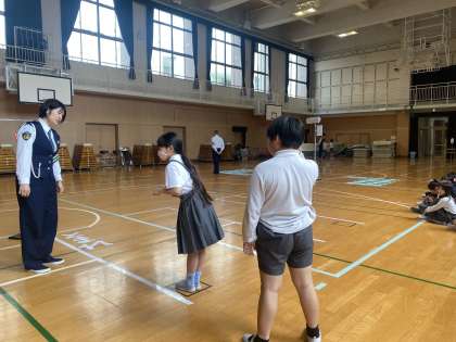 本日、大阪府警の方が4年生に交通安全についてお話ししに来てくださいました。道路で注意することや、自転車の乗り方などについてお話を聞いたり、道路に見立てたコースを歩いて確認したりしました。