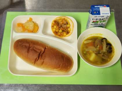 今日の献立は、豚肉と野菜のカレースープ煮、変わりピザ、ミックスフルーツ(缶)、黒糖パン、牛乳です。