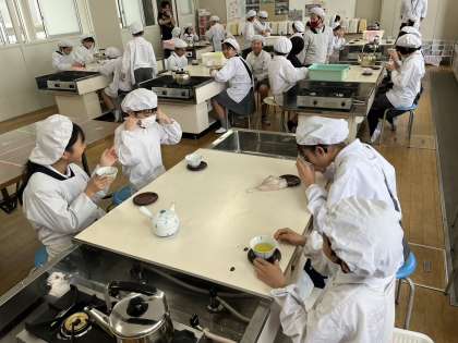 家庭科室でガスコンロの使い方を学習した後、初めての実習「お茶会」をしました。