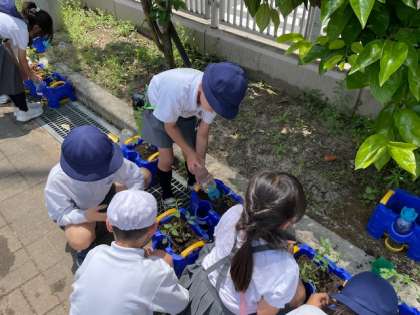 5月20日(月)2年生は、生活科で育てるミニトマトを植えました。わくわくしながら自分の苗を手に、土と一緒に鉢に入れ水をやりました。たくさん実ができてくれることを、願っていました。