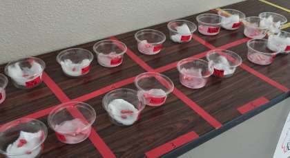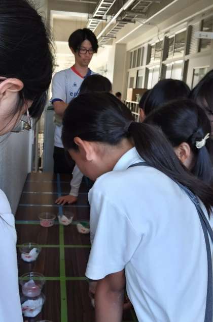 水や空気など発芽に必要な条件は何かをインゲン豆を使って観察しています。