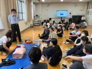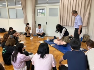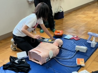 もしもの時に備え、胸骨圧迫やAEDの使い方を学び、1人ずつ人体モデルを使って蘇生法を実践しました。