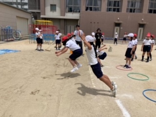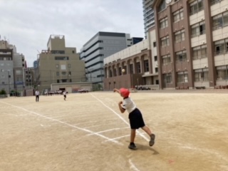 今週は運動場で学年ごとに、50メートル走やソフトボール投げ、立ち幅跳びなど、新体力テストをしています。