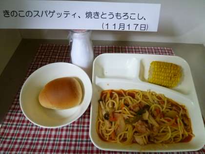 秋が旬のきのこをたっぷり使ったスパゲッティが出ました。きのこの苦手な児童もいましたが、がんばって残さずに食べました。黒糖ロールはやわらかく、スパゲッティがあるので、パンの量がいつもの半分のサイズのかわいらしいものでした。