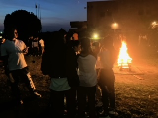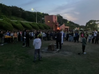 みんなが待ちに待ったキャンプファイヤー。各クラスの出し物をしながら楽しんでいます。火の神様も登場して盛り上がりました。