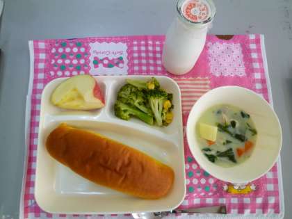 パンプキンパンは、オレンジ色がきれいでした。北海道産のほたて貝のうまみがたっぷり入ったシチューは、手作りのルウでとろみとコクがつけられ、おいしかったです。りんごは山形産の「サンふじ」で、蜜入りのものでした。