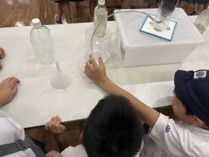 沈渣池や貯水池などを見たり、水をきれいにするためにオゾンや活性炭をどのように使っているかを学びました。また、実験コーナーでは、濾過することで実際に水がきれいになるようすを体感することができました。
