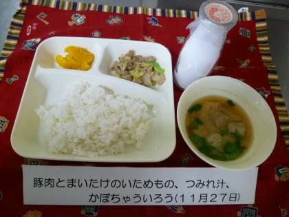 いためものは、旬のまいたけの香りがよく、キャベツとの組み合わせがよい彩りでした。いわしのつみれが入った汁は、くさみがなく、しょうがの効果で体があたたまりました。手作りの和風デザート、かぼちゃういろうは、オレンジ色がきれいで、自然の甘みがおいしかったです。