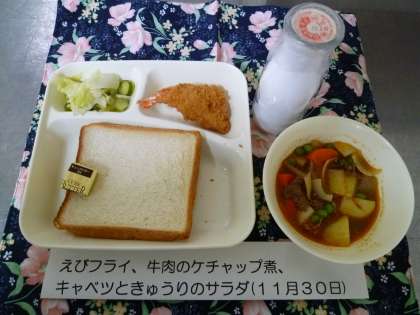 11月最後の給食は、豪華なえびフライが出ました。ケチャップ煮やサラダには、野菜がたっぷりでヘルシーでした。