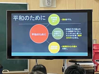 広島の修学旅行で自分たちが学んできたことに加えて、帰校後調べたことをグループでまとめ、戦争や平和について学習しています。