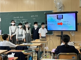 さすが6年生、パワーポイントを使う事にもすっかり慣れ、班ごとに工夫を凝らし、画面にうつしながら発表を行いました。