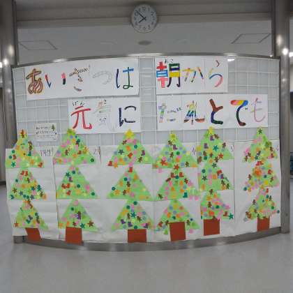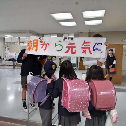 代表委員会の児童が朝早くから登校して、いろいろな場所であいさつの声かけをしました。