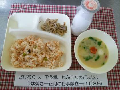 お正月の行事献立で、ぞうに、さけちらし、れんこんのごまじょうゆ焼きでした。れんこんは穴を通して先が見えることから、「先の見通しが良いように」と願っておせち料理に入っています。400人分以上のとらしずしを混ぜる作業はとてもたいへんで、給食室は大忙しでした。ぞうにには、丸くてかわいらしい白玉もちやさといも、花型のだいこんやにんじん(年に1度だけ使える伝統野菜の金時にんじんでした)が入っていました。