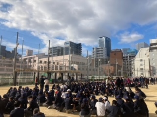 今回の避難訓練では休み時間に、地震とそれにともなう津波が発生したことを想定して行いました。運動場に1次避難した後、津波に備えて3階以上に2次避難します。