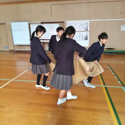 4年生は「簡易トイレ」の使い方、5年生は災害時の「三角巾」の使い方、6年生は講堂で「毛布担架」の体験をしました。