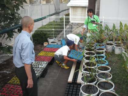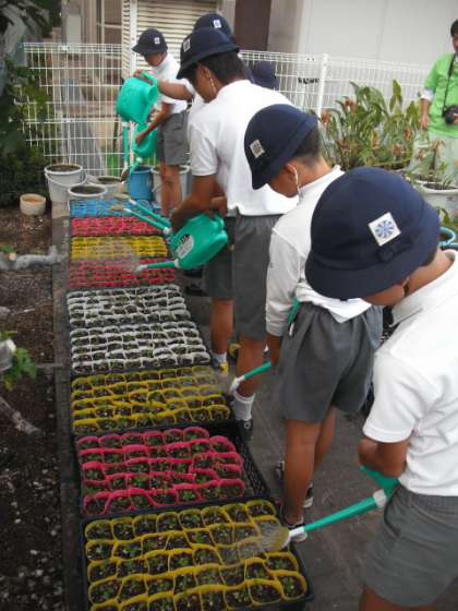 ポットに植えた苗を扇町みのり園の中に運びました。