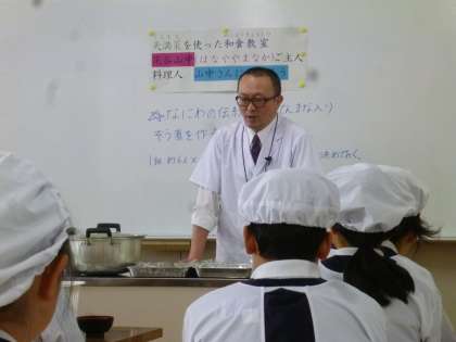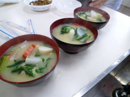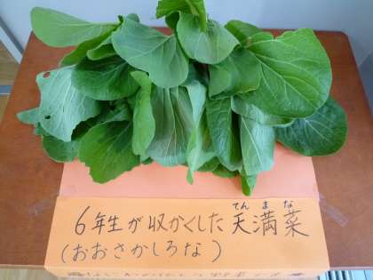 6年生が秋から育てたてんまなを使って、関西風白みそ雑煮を作って食べました。地域の料理人山中さんにゲストとして来ていただき、和食についてお話を聞き、道徳の授業と連携した体験活動になりました。地域のお餅屋さんにつきたてのおもちを配達していただき、おいしいお雑煮ができて、子どもたちは大喜びでした。