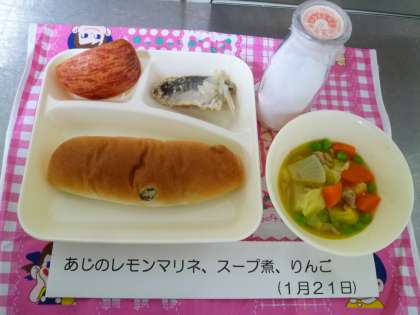 志賀高原から送られてきたりんごは、蜜入りで甘かったです。スープ煮には、家庭ではあまり使われていない「てぼ豆」が入っていました。てぼ豆は、大豆と同じような大きさですが、、いんげんの仲間で色は白色、白あんの材料としてよく使われている豆です。子どもたちはお箸を上手に使って食べていました。あじのレモンマリネには、国産のレモンが使われ、揚げたアジをさっぱりと食べることができました。