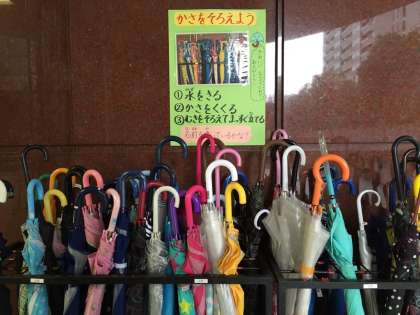 道徳の授業で学ぶ「規則正しい生活」につなげていくため、靴箱や傘立てを丁寧にそろえられるよう、掲示を作成しています。